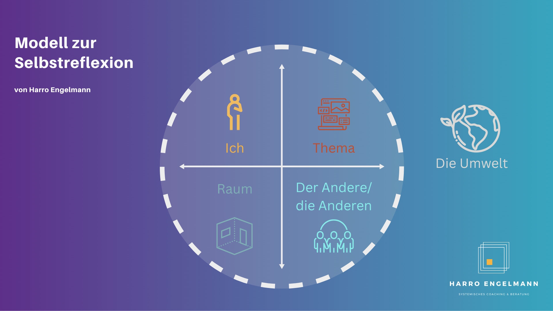 Zentral in diesem Modell ist die Beziehung der vier Dimensionen, die sich innerhalb des gestrichelten Kreises bewegen. Dabei gibt es ein “Thema”, das durch ein “Ich” bearbeitet wird. Da die Bearbeitung des “Themas” auch von “Anderen” abhängig sein kann, taucht diese Dimension ebenfalls im Schaubild auf. Zudem wird durch das Modell die Dimension des “Raums” berücksichtigt, in der sich auch die Dimension “Zeit” wiederfindet. Das Zusammenspiel der vier Dimensionen entscheidet über die Art, wie erfolgreich, konfliktreich, fokussiert, etc. Veränderungsprozesse oder Projekte gestaltet werden.
